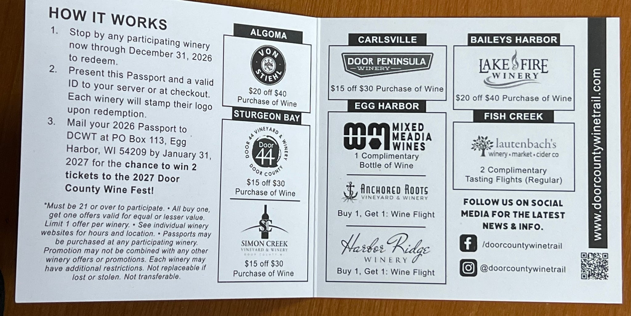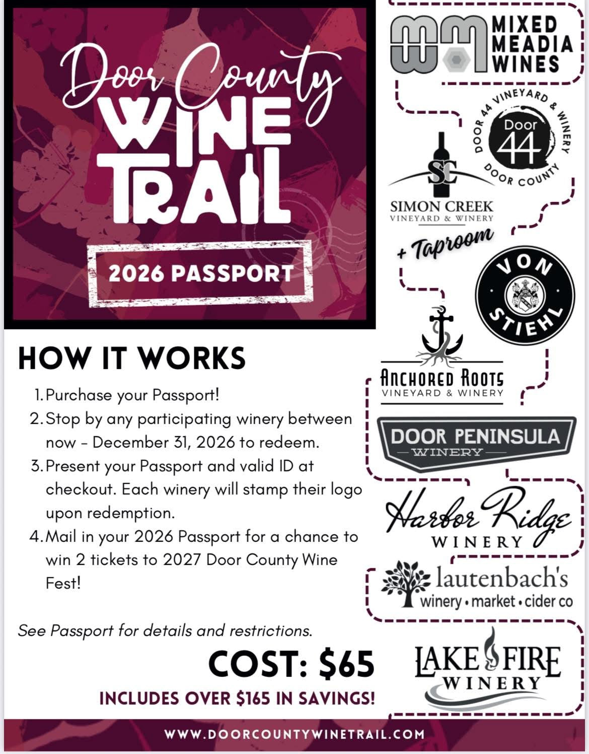 *Mail your completed pass for a chance to win 2 Door County Wine Fest Tickets(2027) - valued at over $165! See pass for details.